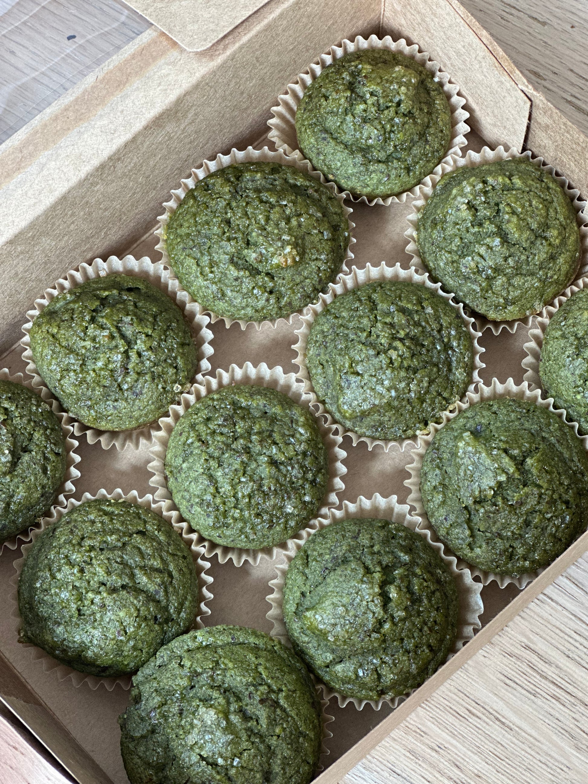 almond flour, oat flour*, fresh spinach*, banana*, almond milk*, maple syrup*, pasture-raised egg*, coconut sugar*, baking powder, baking soda, cinnamon*, sea salt
