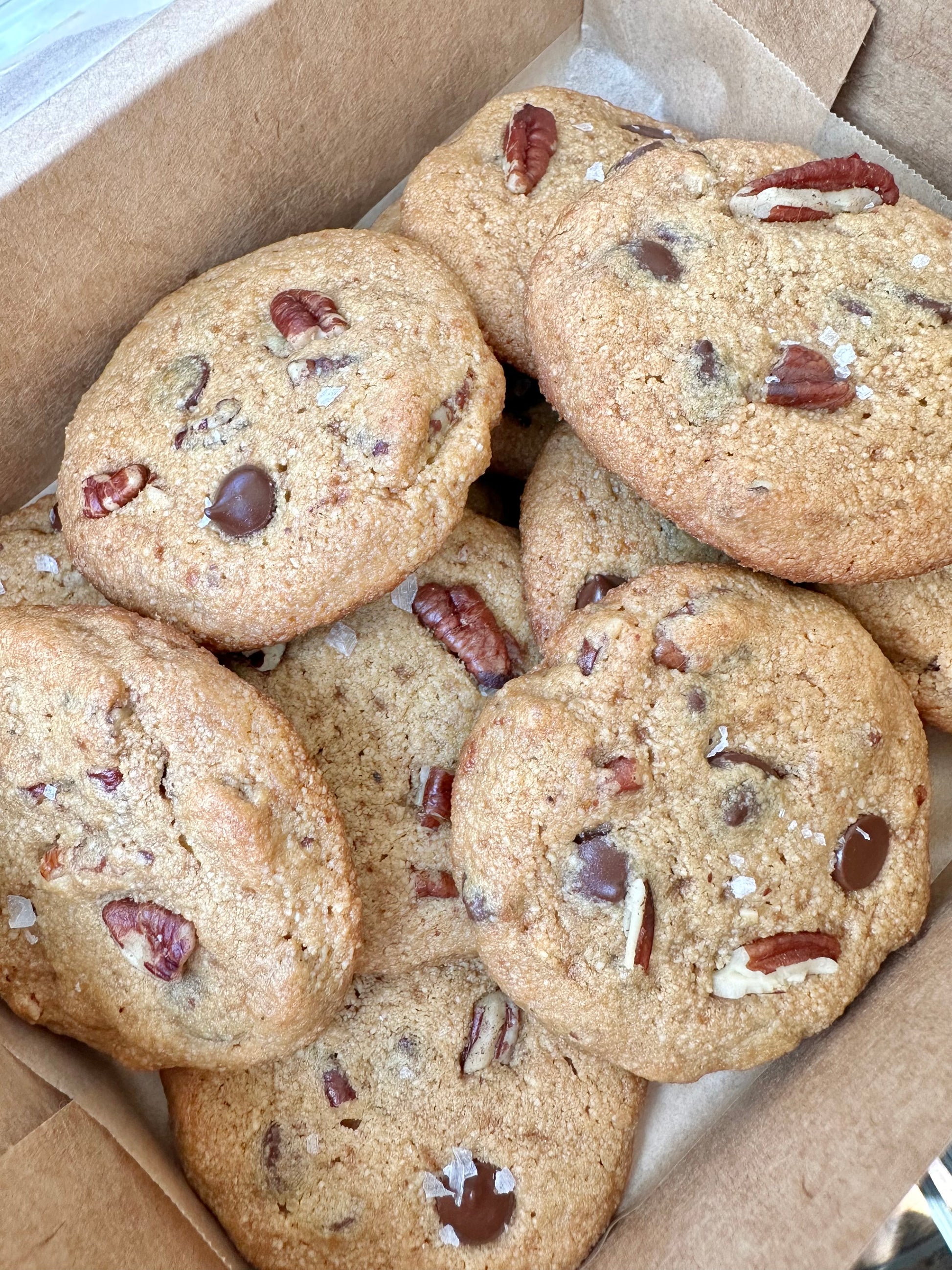 almond flour, grass-fed butter*, pasture-raised egg*, coconut sugar*, vanilla extract, sea salt, vegan chocolate chips*, pecans
